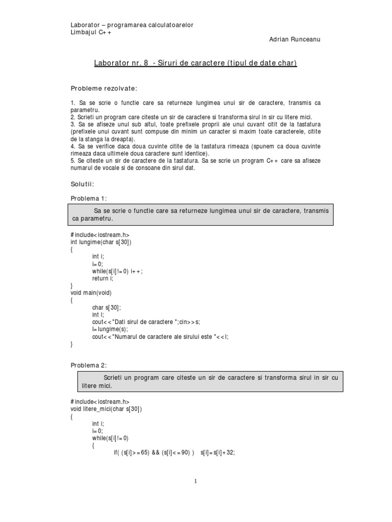 vizitati articolul complet aici : https://siruridecaracterecnmk.weebly.com/functii-siruri-de-caractere.html Funcţiile cin şi cout suportă şirurile de caractere terminate cu caracterul nul, astfel pot fi citite respectiv afişate şirurile de caractere. A.braicov, turbo pascal, culegere de probleme; } // inlocuirea unui caracter cu alt caracter.