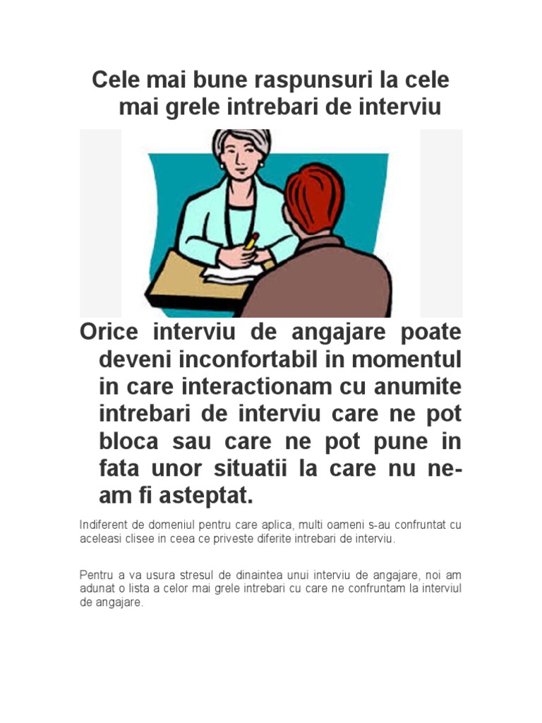 Interviul de angajare este obstacolul cel mai mare care stă în calea ta și a viitorului tău job. Trimisă pe 28 octombrie 2010. Acest lucru demonstreaza totodata ca te intereseaza compania respectiva.